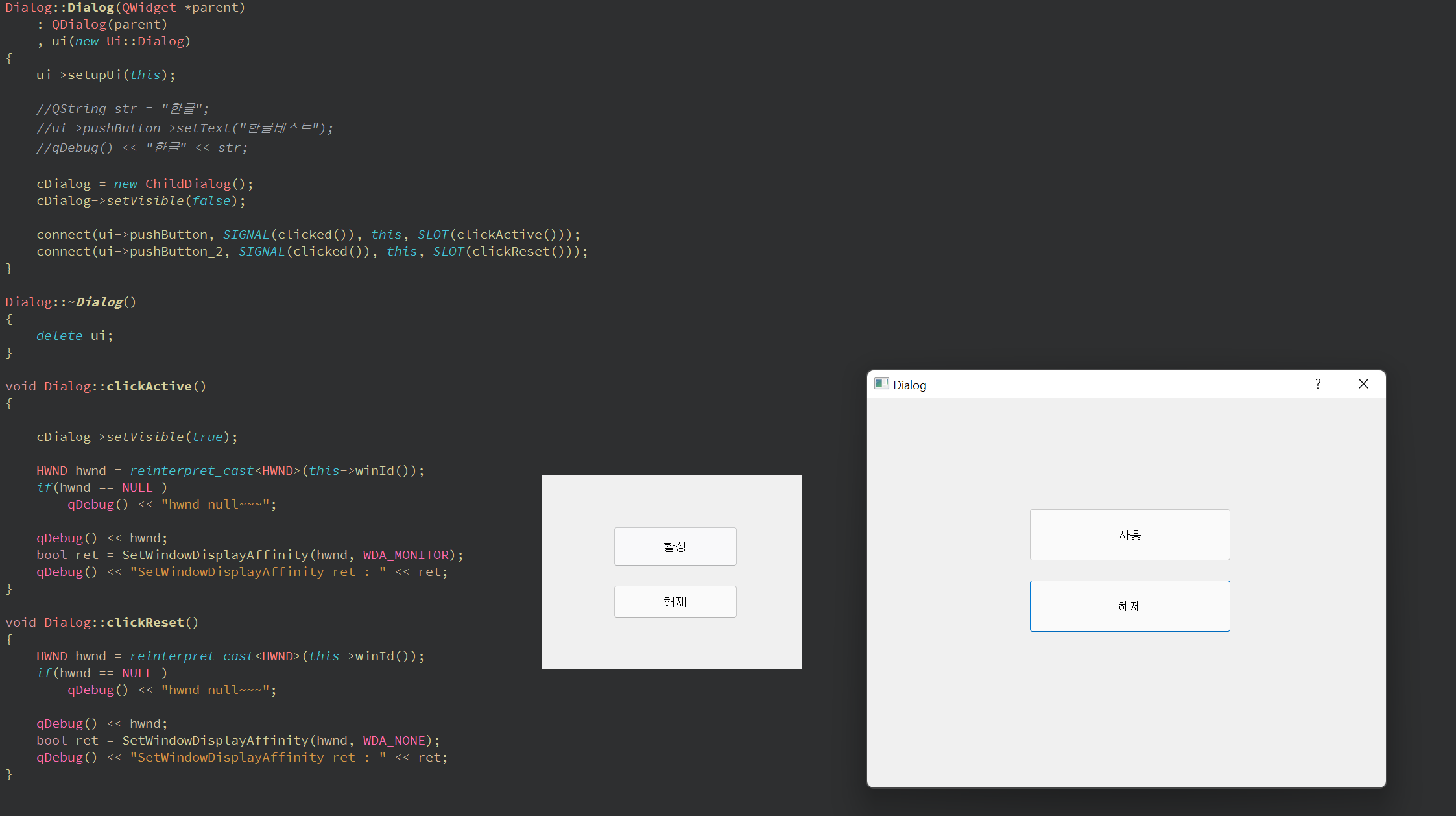 - 첫번째 줄 : 현재 dialog(widget)의 winId를 Windows API HWND 변수로 형변환.