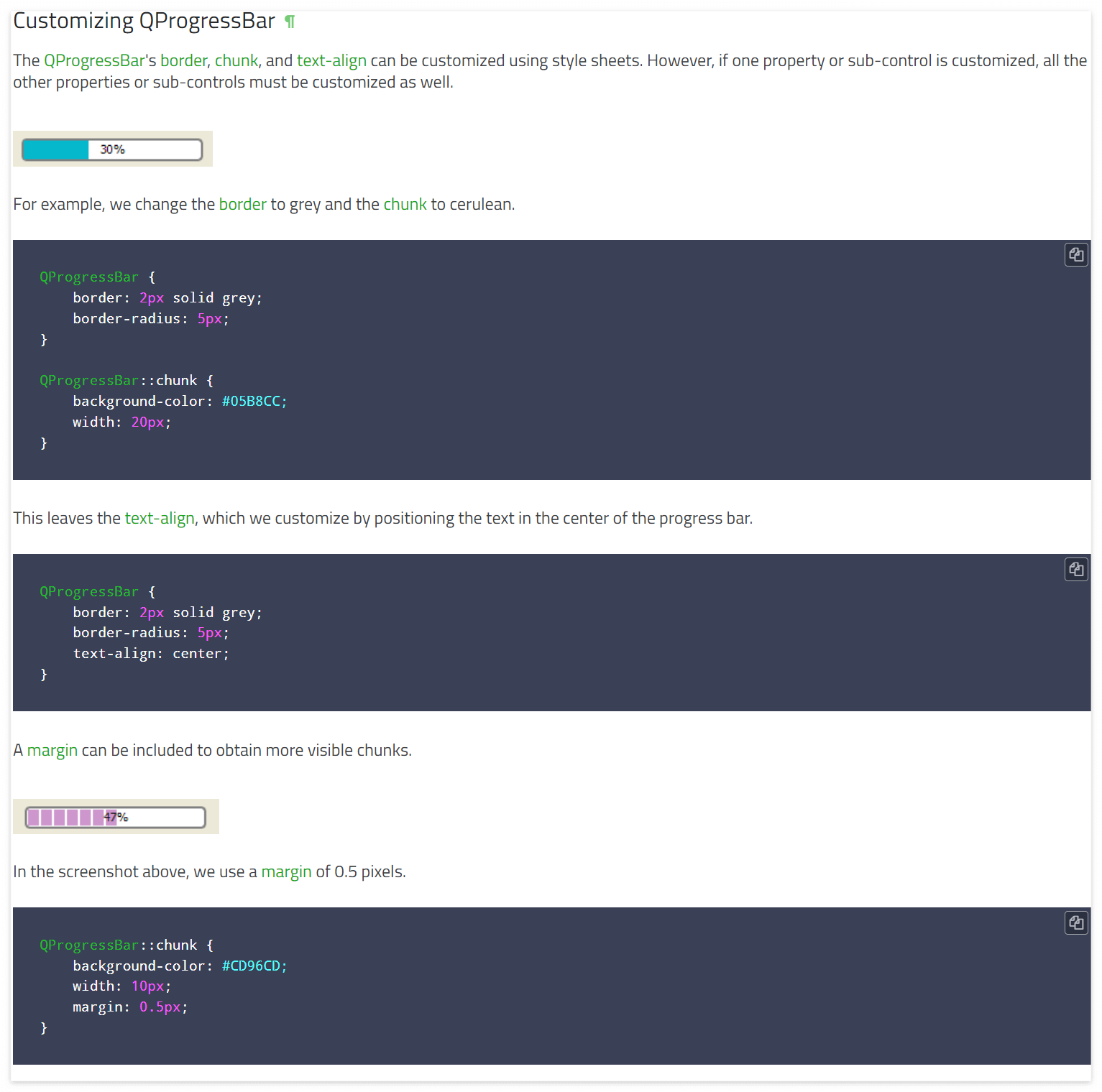 아래는 공식 문서에서 QProgressBar 관련 샘플인데, 이렇게도 되는구나 참고하시면 됩니다.